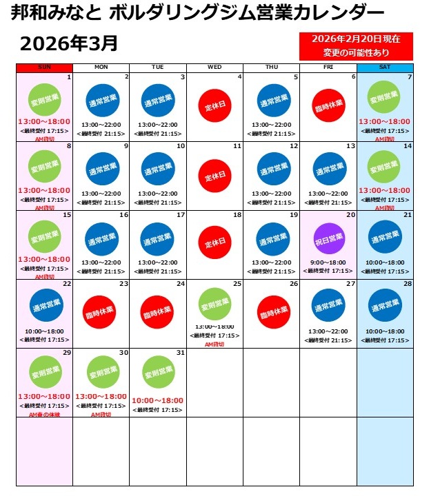 ボルダリングジム2026年3月2月営業のお知らせ