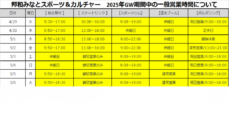 邦和みなと スポーツジムGW期間中の営業は以下の通りとなります。